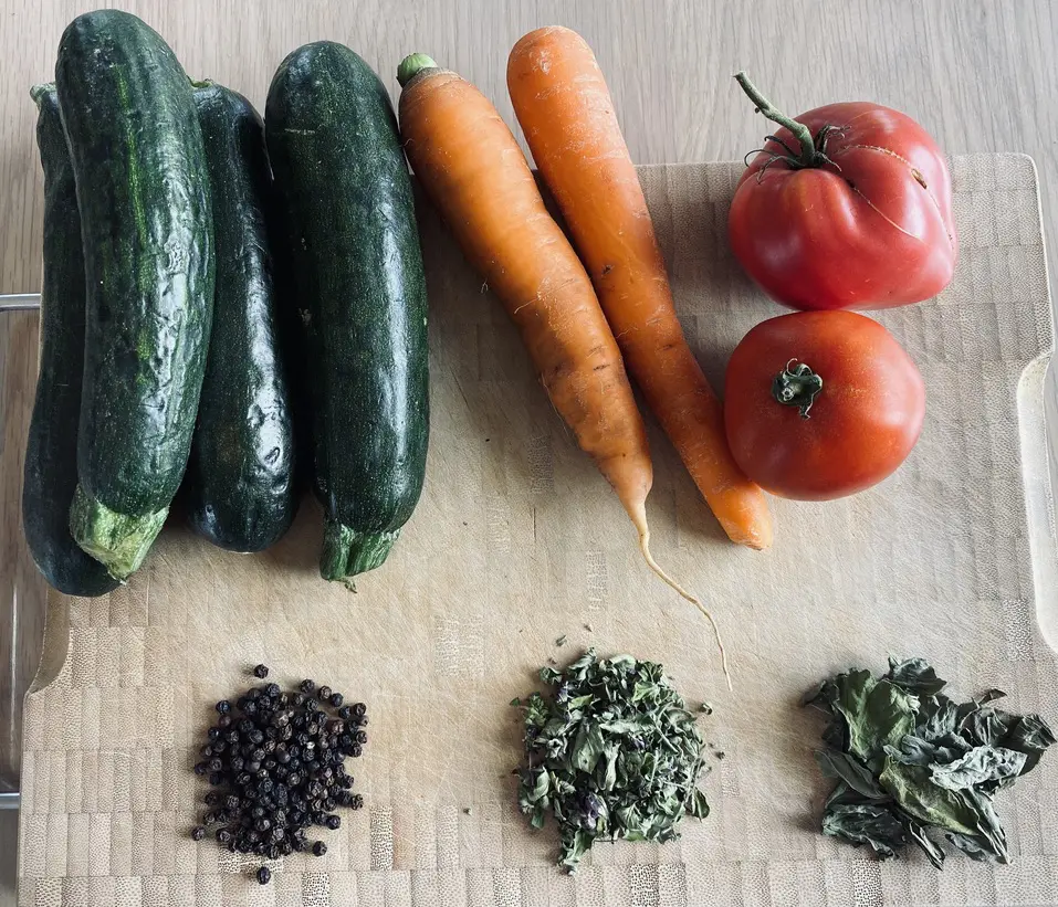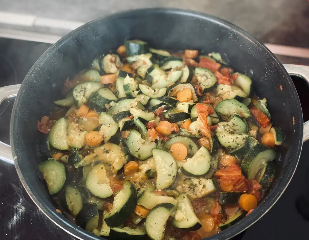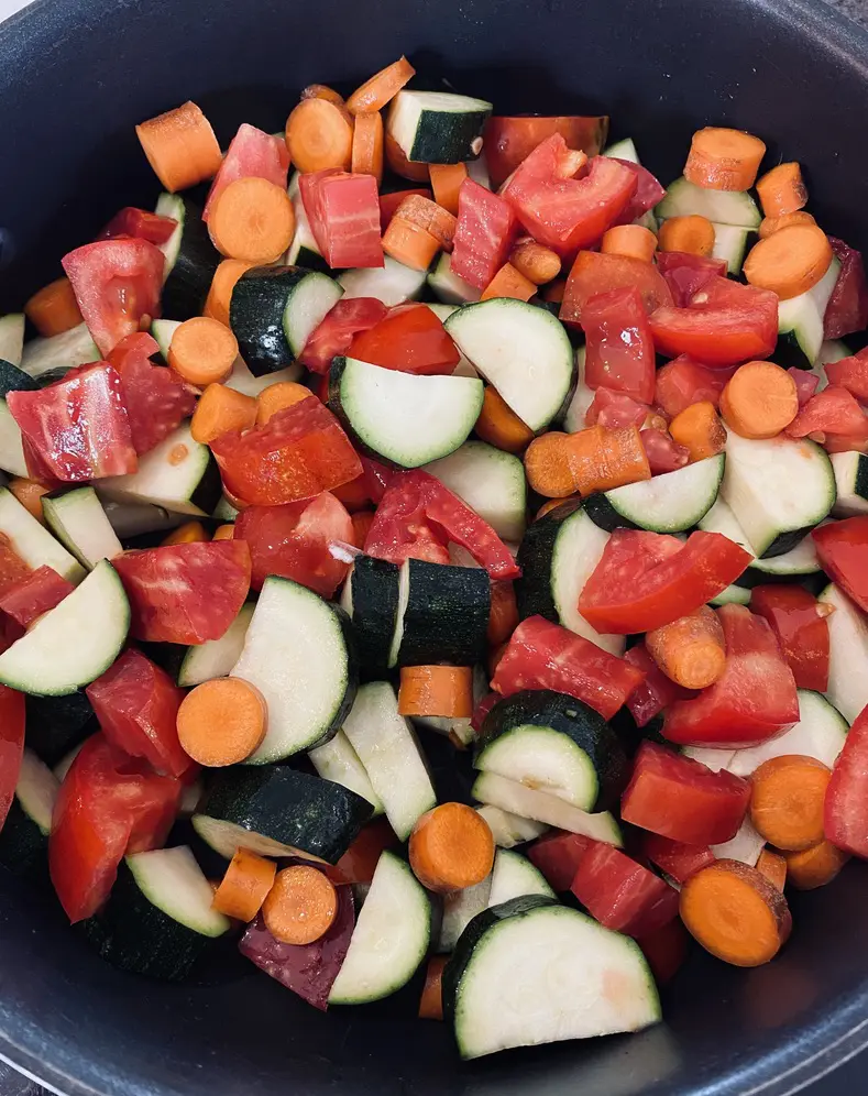 Couper les courgette, tomates et carottes en morceaux et les mettre à revenir dans un peu d’huile pendant 20 minutes.
