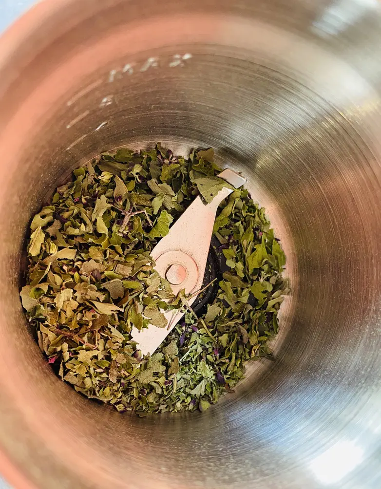 Mixer ensembles les herbes aromatiques (Origan vulgaire et basilic vert) avec un moulin électrique. - Préparation des légumes :