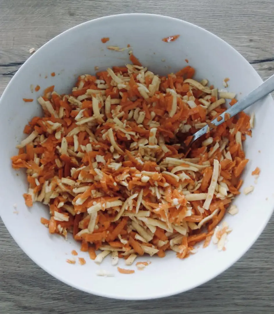 Éplucher les carottes et les panais, puis les râper (pas trop finement).