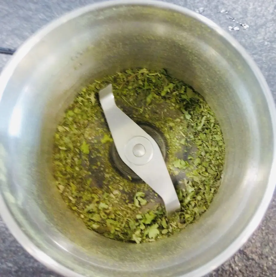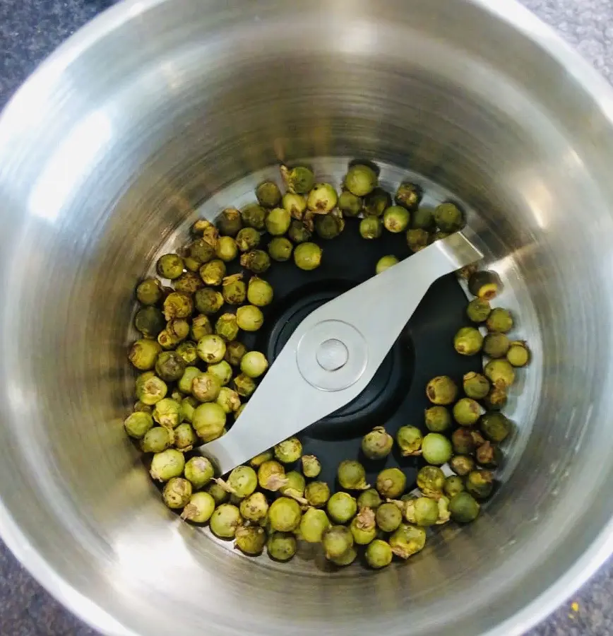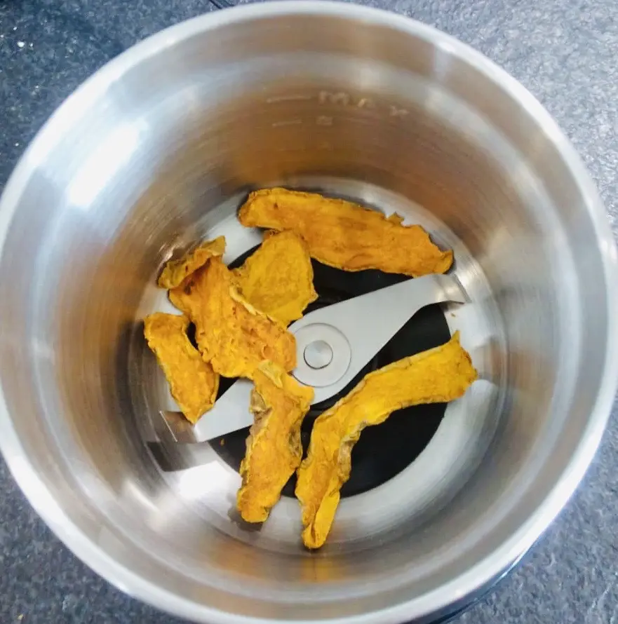 Réduire séparément le curcuma et le poivre vert en poudre avec un moulin électrique.
