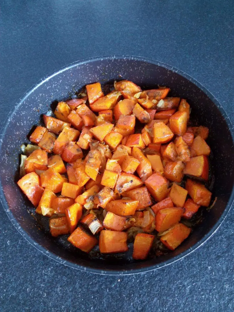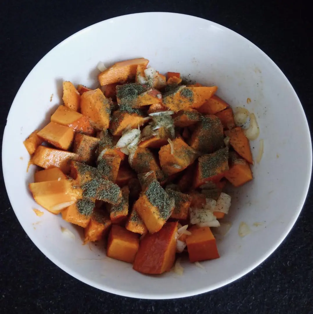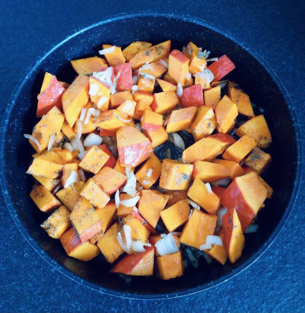 Bien mélanger et enfourner pour 30min, jusqu’à ce que le potimarron soit bien doré.