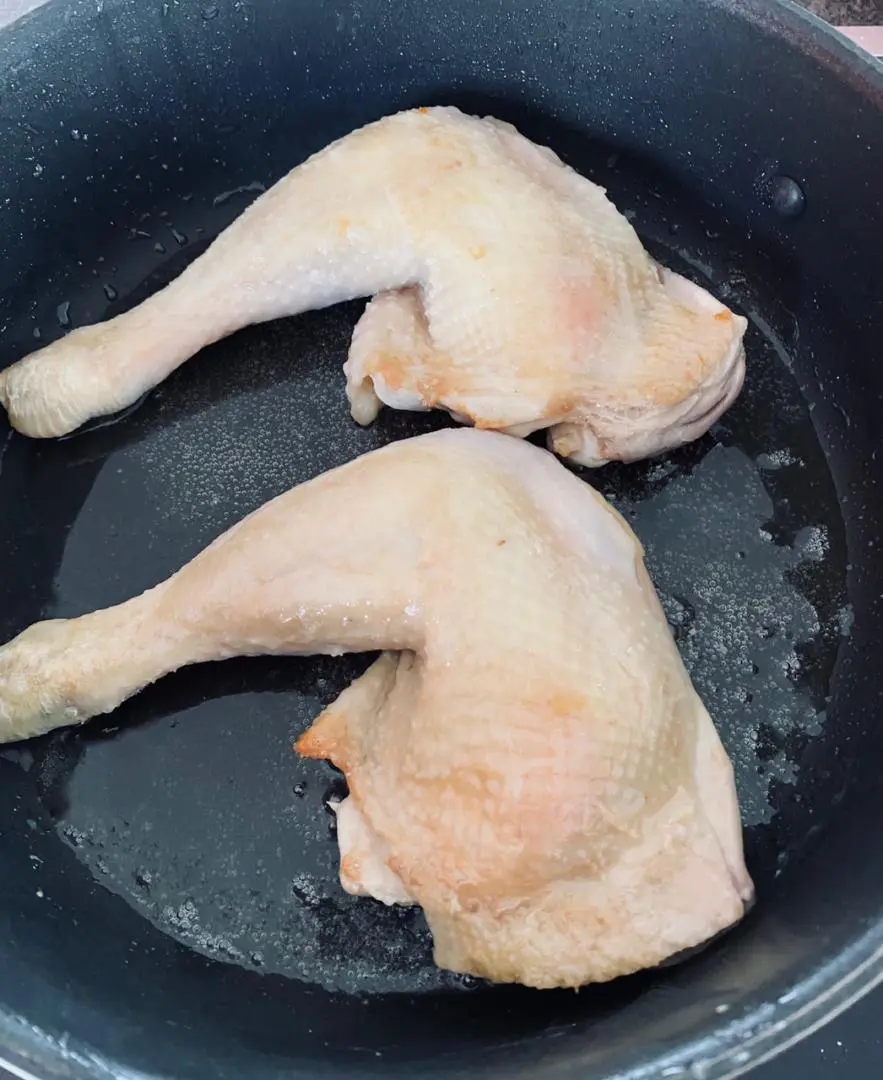 Saler et faire revenir le poulet dans l’huile d’olive pendant 10 minutes à feu vif, afin de le faire dorer.
