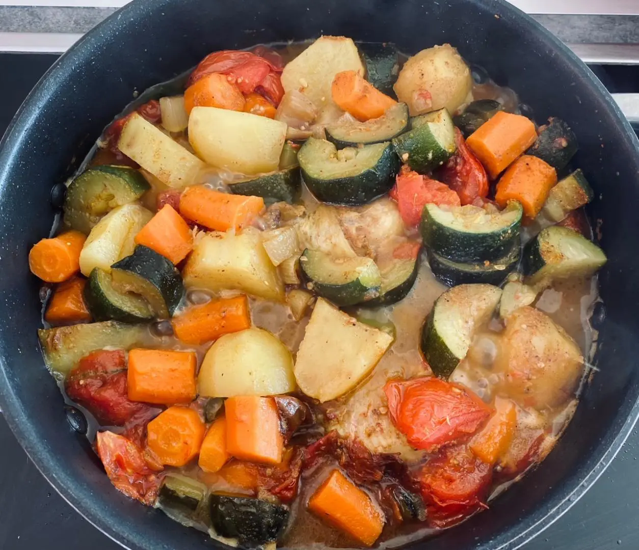Une fois le poulet doré, ajouter tous les légumes, le Ras el Hanout, du sel et le demi-verre d’eau.