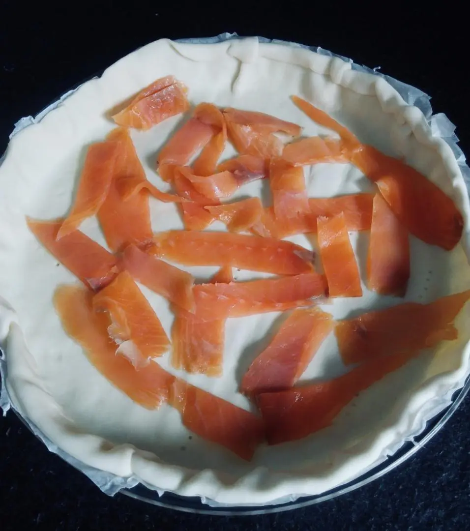 Détailler la truite en lamelles d’environ 1cm de large, les répartir sur la pâte.