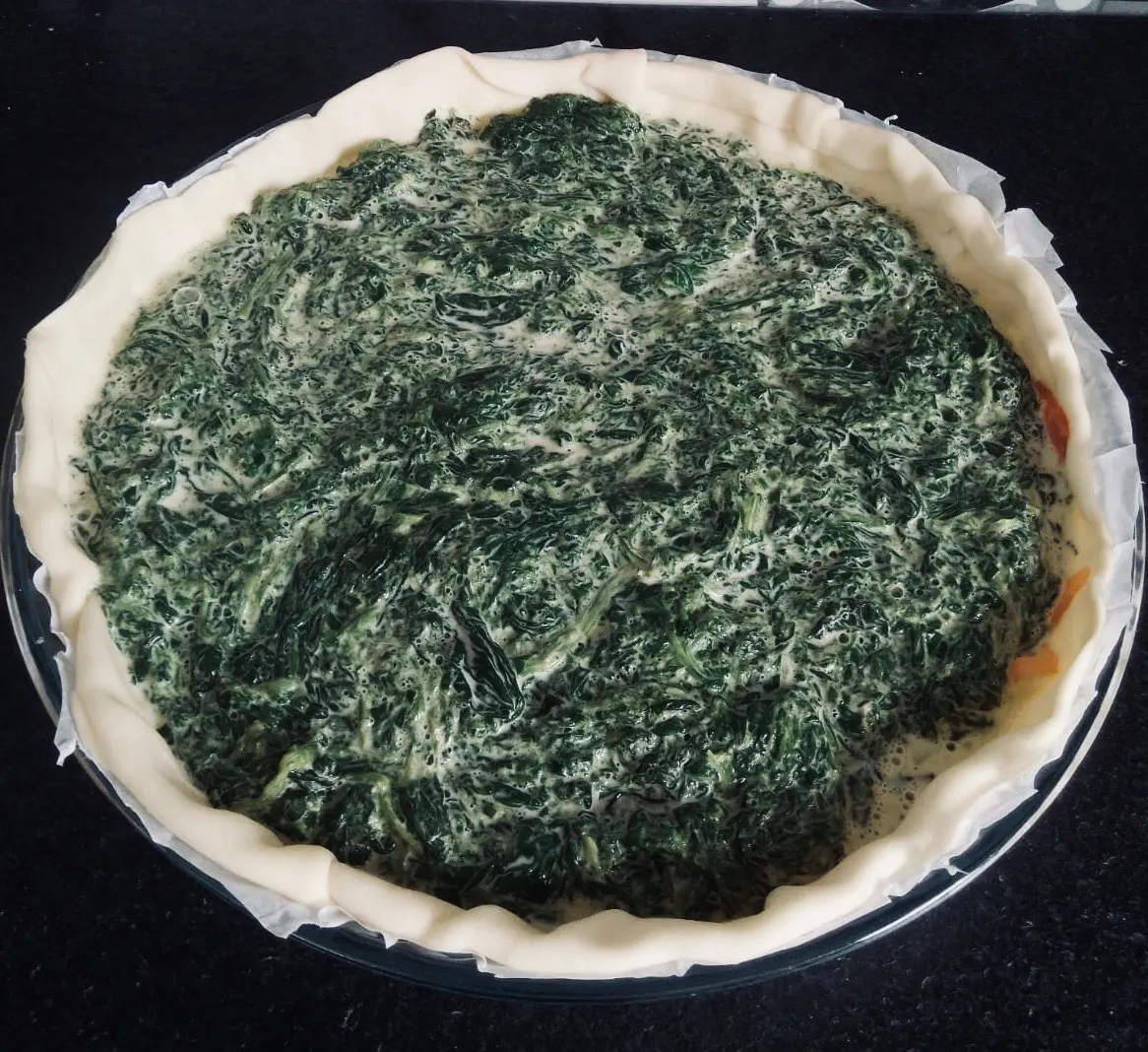Bien égoutter les épinards si nécessaire, les laisser refroidir, puis les mélanger à l’appareil « œufs-crème »
